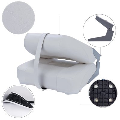 Gemaakt van vinyl van maritieme kwaliteit, de vulling van compressieschuim blijft stevig na langdurig gebruik. Scharnieren van aluminiumlegering en zitframe van injectiekunststof.